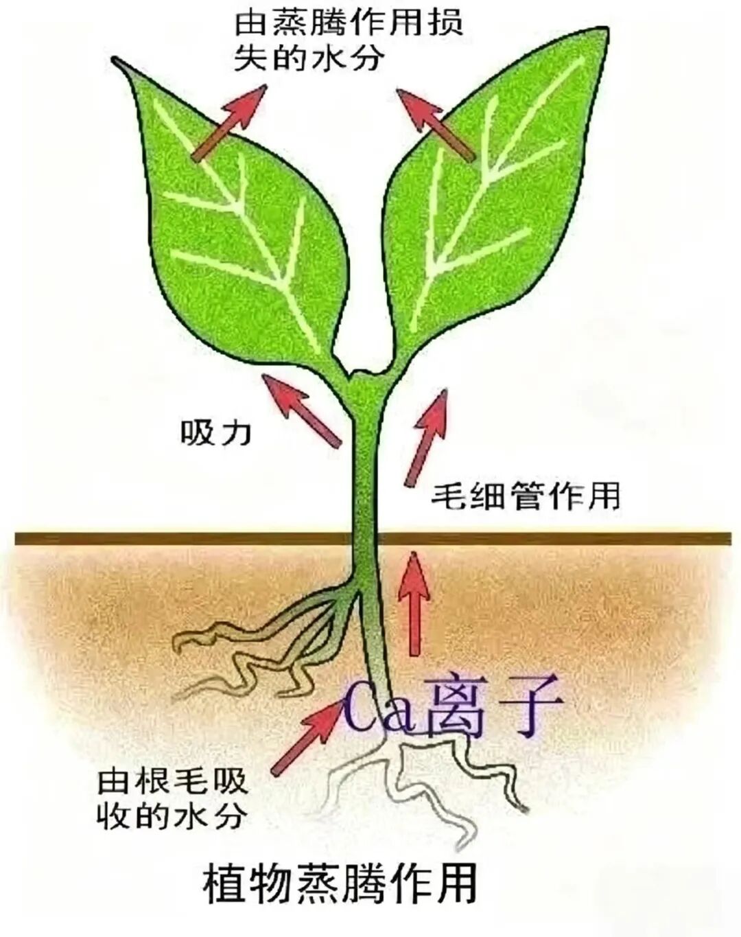 由于钙的分配与蒸腾作用关系密切,叶片与果实可竞争蒸腾水分,果树果实的蒸腾强度远小于叶片,对钙的竞争也远小于叶片,有时甚至发生果实中的钙倒流入叶片,加之叶片中的钙移动性极差,难以向果实再运输,由此导致果实缺钙,引发多种生理性病害。