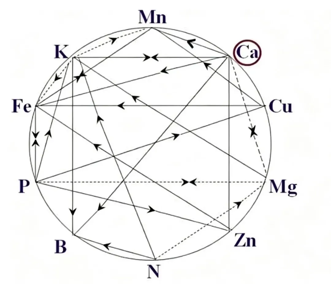 4、拮抗作用生长素具有向基运输的特性,生长素产生多的部位,对钙的竞争力强,果树营养梢生长过旺时,生长素产生远多于果实,引起新生茎叶与果实争钙。因而氮素营养过剩易于引起果实缺钙。也有人认为,氮、钙比过大,或钙、镁比过低,或钾、钙比过低,苹果易感苦痘病;