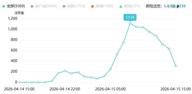 4月14日晚节目播出后,相关话题迅速登上微博、百度、今日头条等平台热搜榜,讨论量激增。4月15日8时,信息量达到峰值,共1114条。此后虽发布量逐步回落,但网友讨论热度不减。