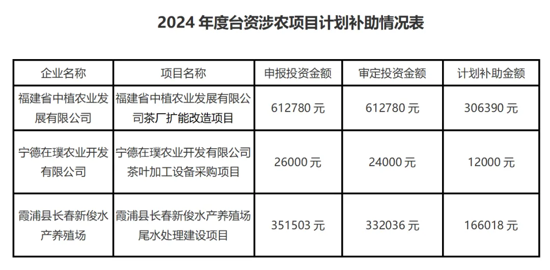 关于给予福建省中植农业发展有限公司、宁德在璞农业开发有限公司、霞浦县长春新俊水产养殖场2024年度台资涉农项目补助的公示