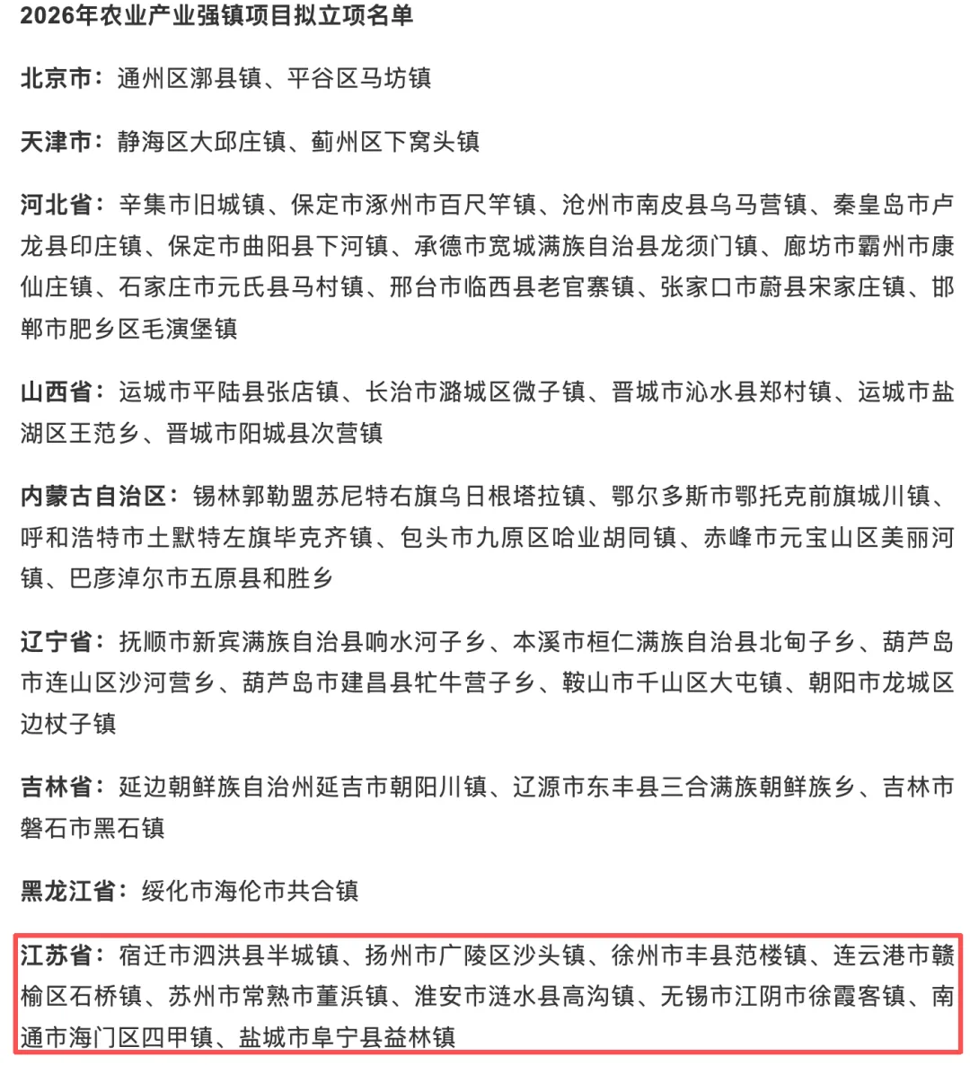 近日,农业农村部发布《2026年农业产业融合发展项目立项名单公示公告》,公示了2026年农业产业强镇项目拟立项名单,江苏省共有9个镇入选,分别是宿迁市泗洪县半城镇、扬州市广陵区沙头镇、徐州市丰县范楼镇、连云港市赣榆区石桥镇、苏州市常熟市董浜镇、淮安市涟水县高沟镇、无锡市江阴市徐霞客镇、南通市海门区四甲镇和盐城市阜宁县益林镇。